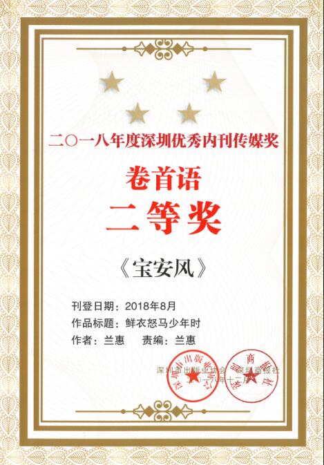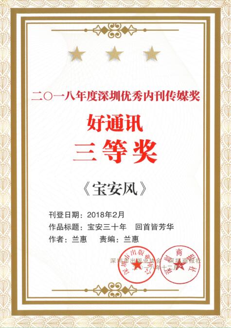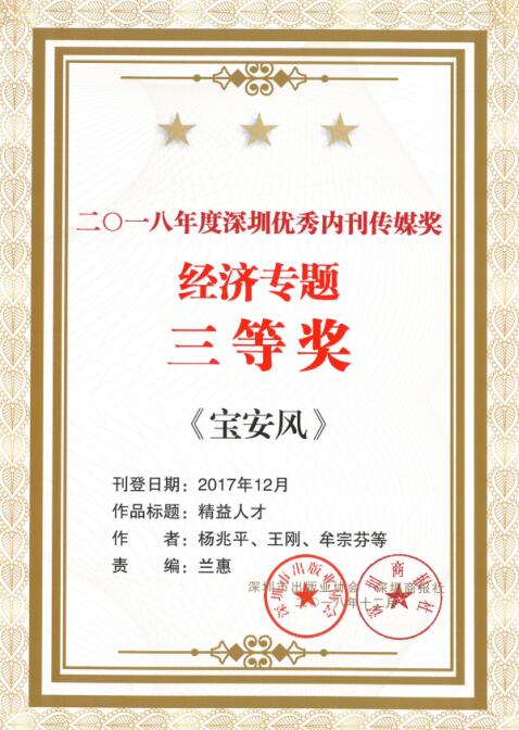 深圳内刊年度综合奖“优秀内刊传媒奖”,由市出版业协会、深圳商报联合组织深圳市新闻出版广电局等资深文化传媒专家评定,每年评选一次,代表着深圳内刊的最高荣誉。《安博电竞·(中国区)官方网站风》在强手林立的深圳内刊界再接再厉,再次获评“深圳优秀内刊传媒奖”之“十佳企业刊奖”。同时,282期“精益人才专题”获“经济专题”三等奖,286期卷首《鲜衣怒马少年时》获评“卷首语”二等奖,283期通讯“安博电竞·(中国区)官方网站三十年 回首皆芳华”获评“好通讯”三等奖。